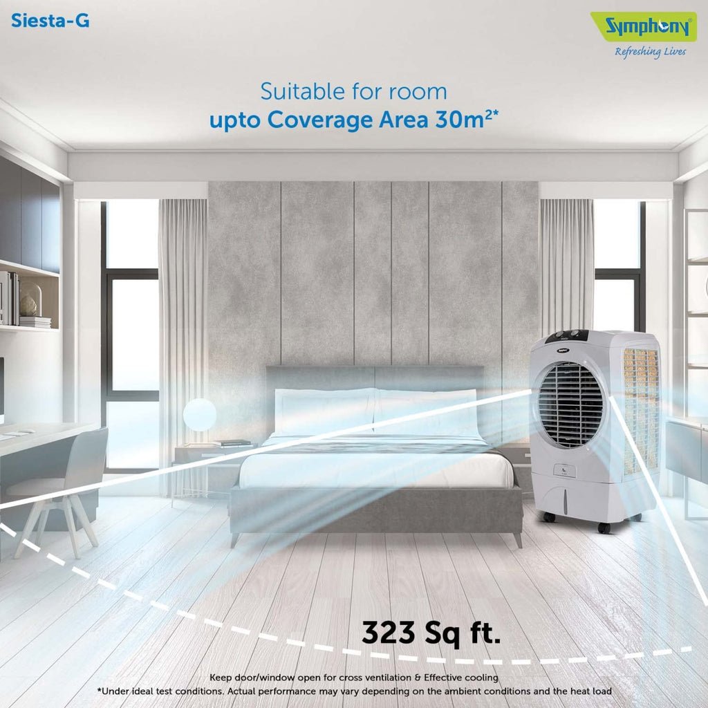 - Portable desert air cooler suitable for rooms up to 30 square meters under ideal conditions.
